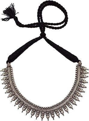 Drawstring closure This black and silver combo necklace is an adjustable one, so you can wear it as a choker, collar or princess, basis the dress code. The metal portion of the necklace is about 9 inches. This is an oxidized silver necklace with drawstring. It is a perfect statement Jewellery for party wear. This is a handmade jewelry for women fashion. Available in Blue, Purple, black, red, golden This Jewelry Is Heritage Of Jaipur Handcrafted by Indian Artisans Devoted To this Craft For Centuries But is Still Trendy, Exquisite & Mesmerizing. Hence These Necklaces Are Not Exact Replicas Of Each Other. A great Return Gifting item for Navratri Programme, Kitty party, Birthday party etc. Dream bigger and get bolder with your look when you wear these necklace. Great gift for your loved ones, girlfriend, fiancee, wife, mother, couple, Valentine or just a friend.Great for your family or beloved one as birthday and holiday present like Thanksgiving Day, Valentine's Day and Christmas Day. CARE INSTRUCTIONS: Avoid Heat & Chemicals Like Perfume, Deo, Alcohol, Etc. Clean With Dry Cotton Cloth.